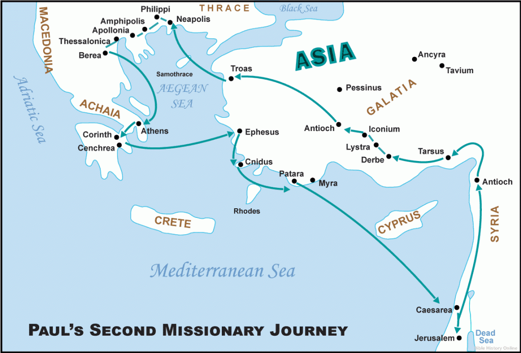In Paul’s second journey he revisited and strengthened the churches in Syria, Cilicia, Phrygia and Galatia. He was accompanied by Silas and Timothy and it lasted for about three years. There was one critical moment when Paul met, in a vision, a man of Macedonia at Troas asking Paul to visit and help them. This experience changed everything and determined the team’s future plans and travels.
