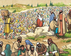 The disciples questioned Jesus as to how they could feed so many that numbered around 4000. Jesus gathered seven loaves and a few fish from the disciples and told the crowd to sit down. Jesus ‘took the seven loaves and the fish and when he had given thanks, he broke them and gave them to the disciples and they in turn to the people.’ So all that were gathered ate and were satisfied.