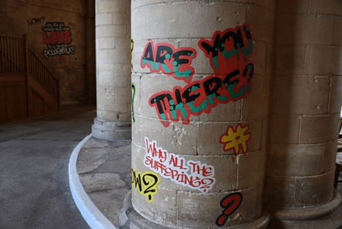 In the news recently (October 2025) there has been praise and criticism about questions that are exhibited in graffiti and posted within Canterbury Cathedral. A number of questions, under the title of Hear Us, represents a collaboration between the poet Alex Velis, and the Cathedral curator, Jacquiline Creswell.